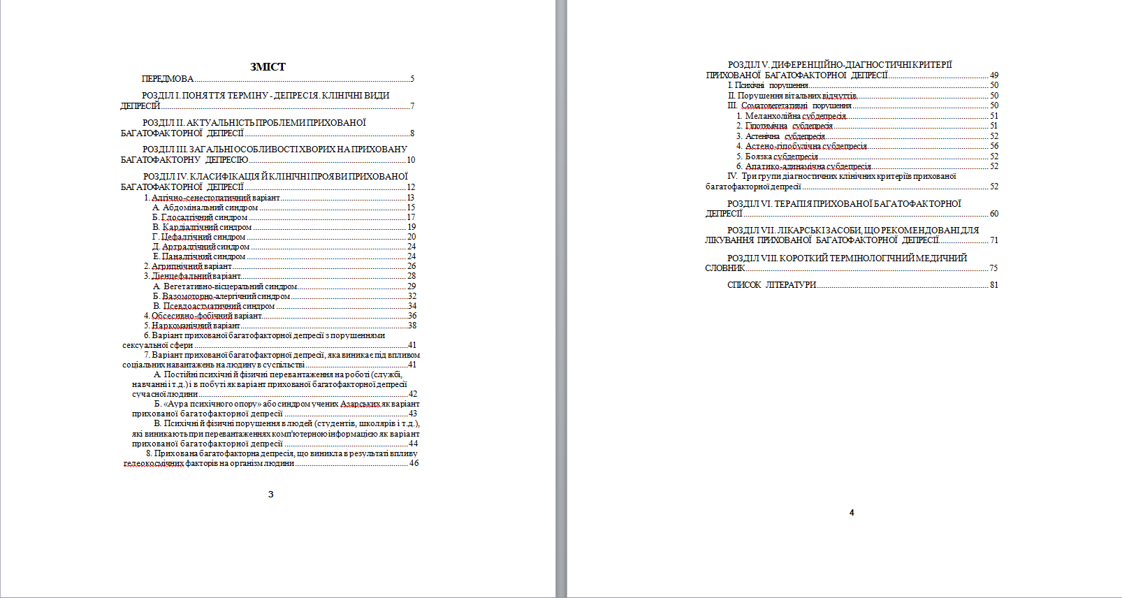 У книзі висвітлені етнологія, патогенез і класифікація депресивних станів, особливості діагностики, клініки перебігу и методів лікування профільних хворих на приховану багатофакторну депресію.